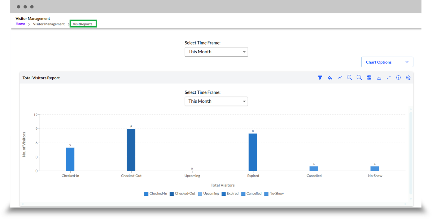Total Visitors Report provides a comprehensive summary of visitor activity, showing counts across statuses such as Checked-In, Checked-Out, Upcoming, Expired, Cancelled, and No-Show in a visual chart format.