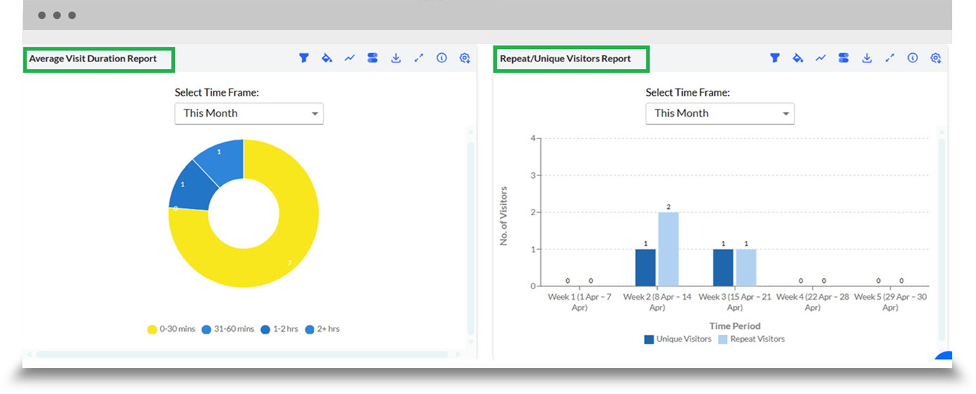 The Visitor Analytics and Reports tab offers detailed insights into visitor behaviour via interactive dashboards and visual reports, allowing users to filter data by timeframes and customize charts, with export options for further analysis.